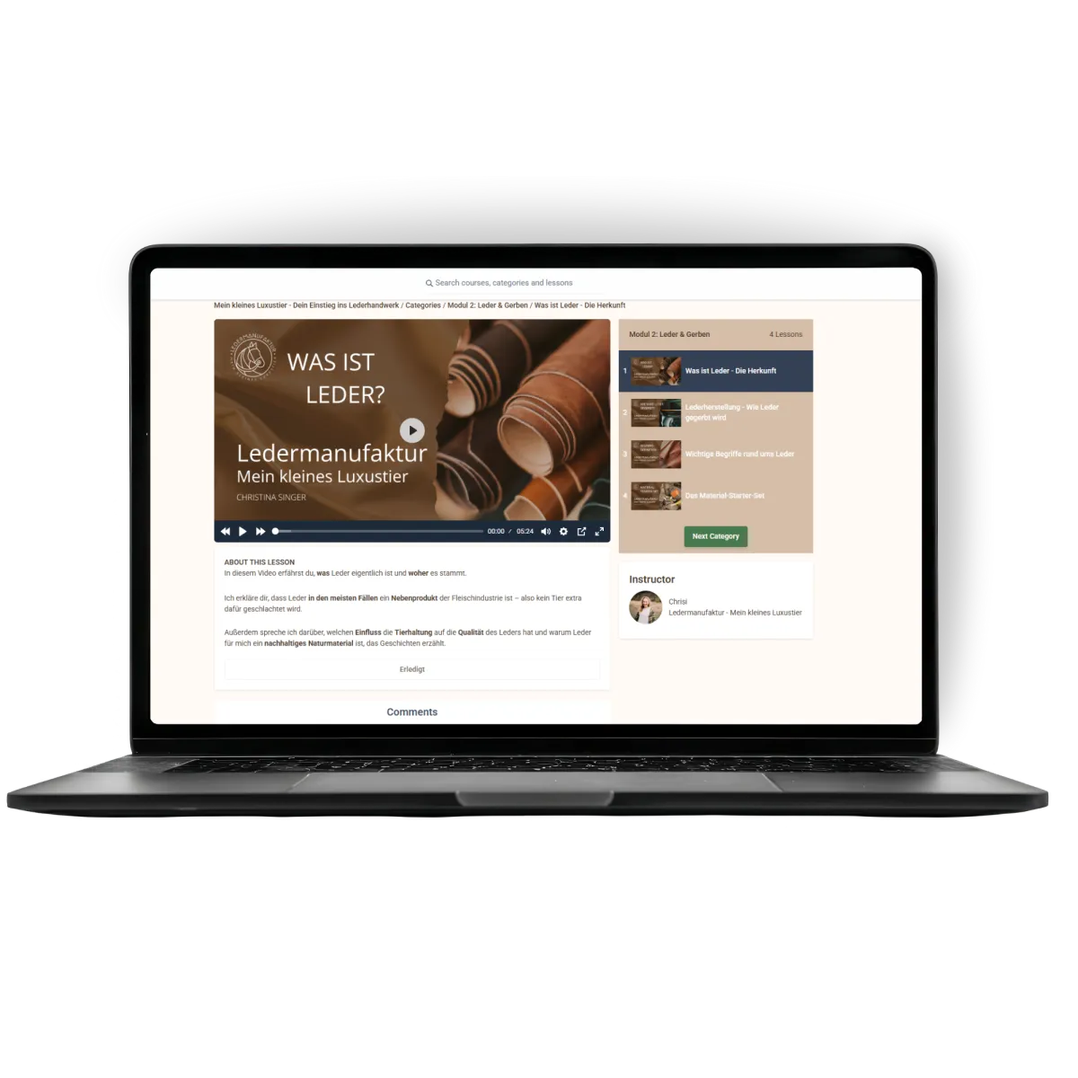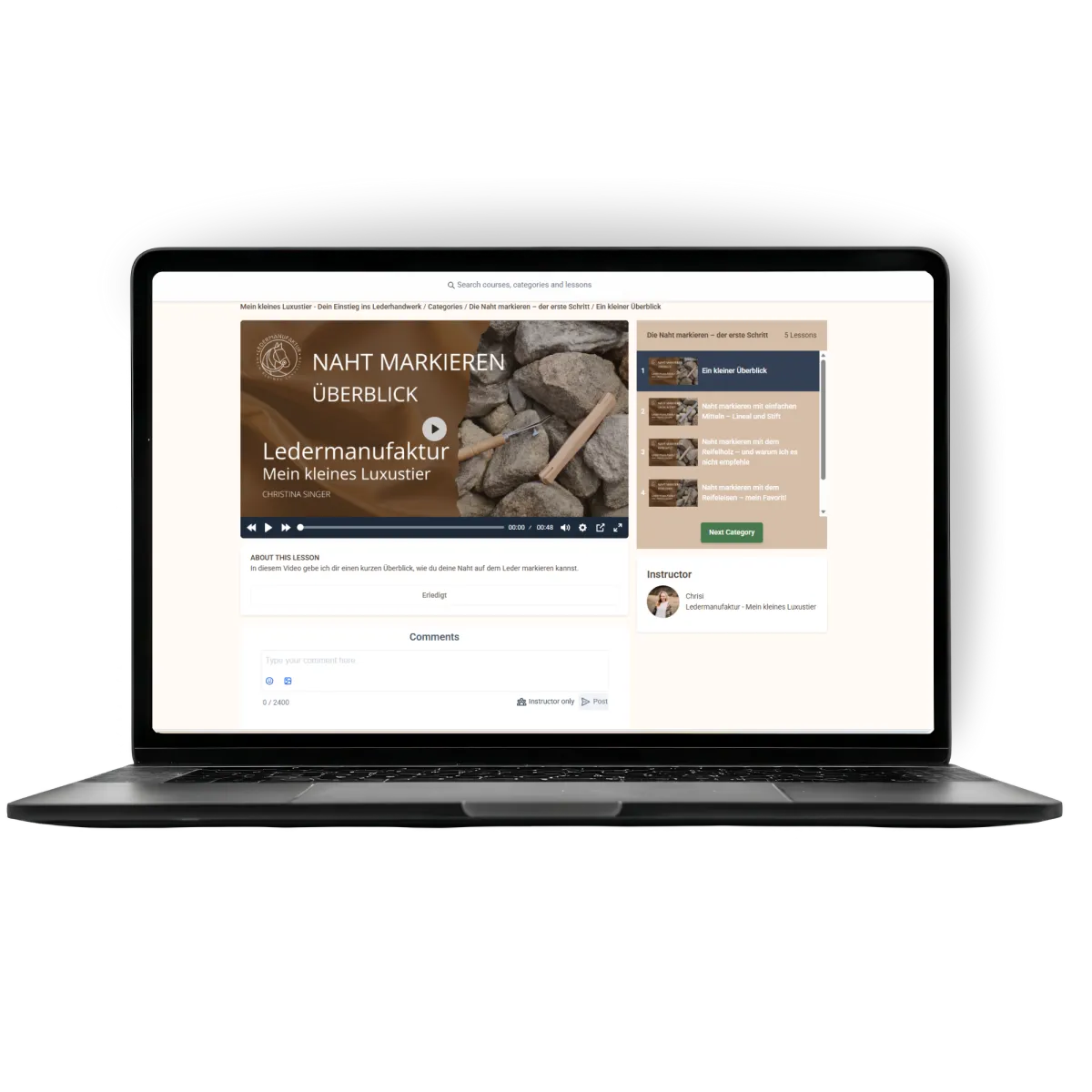 "Ich habe kürzlich am Lederverarbeitungskurs für Einsteiger von Chrisi von mein kleines Luxustier teilgenommen und bin begeistert von dieser Erfahrung. Chrisi erklärt mit viel Geduld, Leidenschaft und Fachwissen das Material, die Werkzeuge und jeden Arbeitsschritt. Individuelle Fragen werden kompetent und sehr zügig beantwortet. Auf der Onlineplattform hat man die Möglichkeit sich mit anderen Kursteilnehmern auszutauschen.